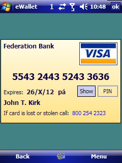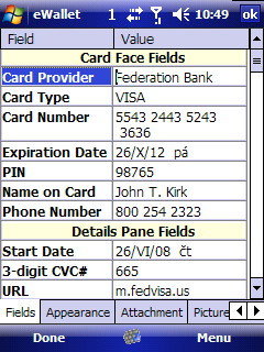 Díky tomu, že u všech záznamů lze upravovat nejen textové informace, ale také vzhled, tak bude záznam s údaji o platební kartě během několika sekund vypadat jako opravdová Visa (viz. obrázek). Lze upravovat barvu pozadí, textu, můžeme vybrat ikonu (v případě platební karty jsou k dispozici dvě – Visa a Mastercard. Nesmíme zapomenout ani na to, že ke každému záznamu lze připojit textovou poznámku a libovolný soubor uložený v paměti či na kartě kapesního počítače.