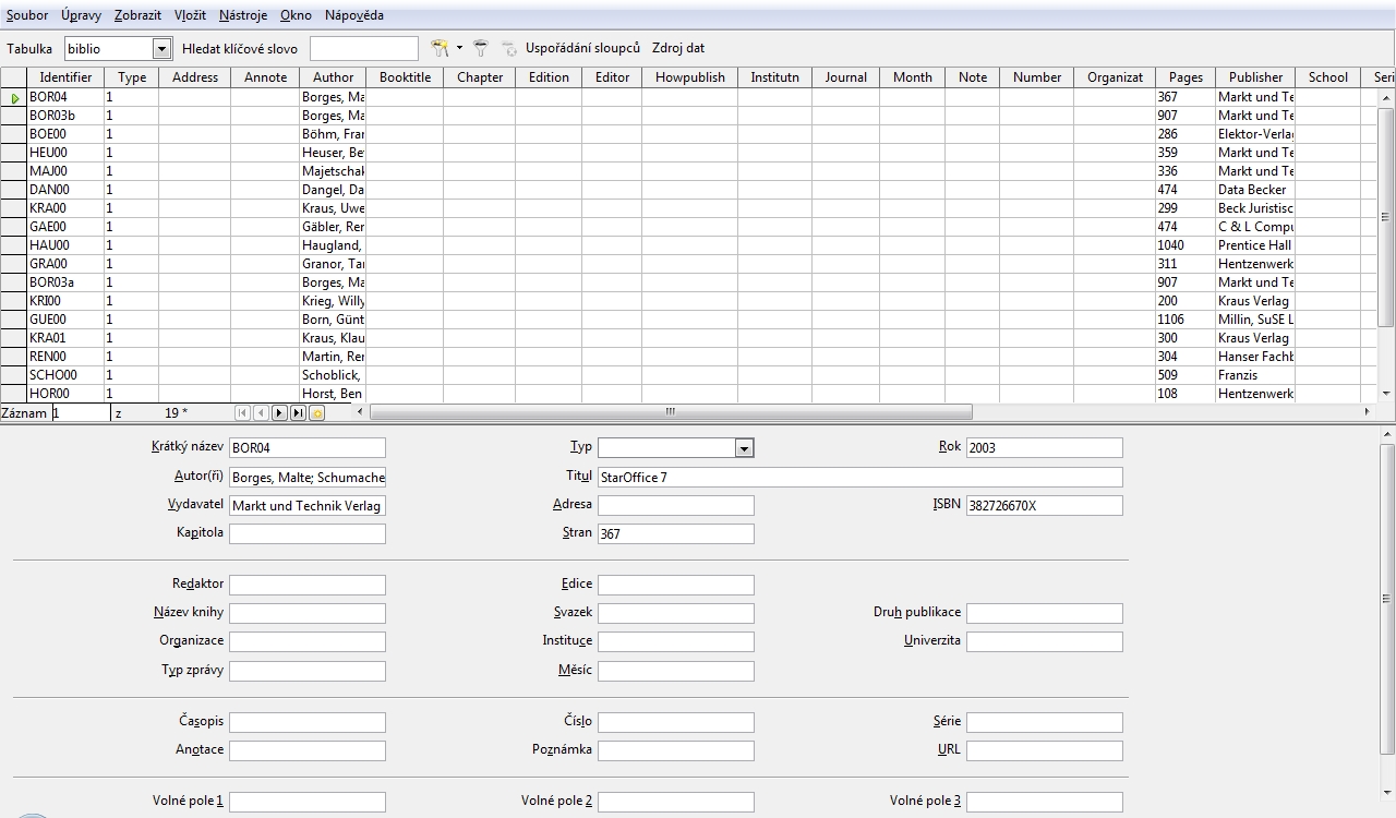 Pokud často citujete, pak určitě oceníte možnost vytvořit si databázi citovaných zdrojů a z ní vkládat citace. Vyberete „nástroje“, zde „seznam použité literatury“. Můžete smazat předdefinované položky a vytvořit si vlastní databázi používaných knih či časopisů. Při samotné citaci pak stačí jen, když v menu „vložit“ zvolíte „rejstříky a tabulky“ a zde vyberete možnost „vložit položku použité literatury“. Nejvýhodnější je orientovat se pomocí smysluplně zvolených krátkých názvů. Závěrečný seznam pak vložíte prostřednictví menu „vložit“ – „tabulky a rejstříky“ – „vložit tabulky a rejstříky“. Hned na první kartě zvolíte typ jako seznam použité literatury. Na druhé kartě, nesoucí název „položky“, doporučuji předdefinované pole („struktura“) smazat a nadefinovat si vlastní podle potřebné citační normy. Poslední krok je nutné činit tak často, jak střídáte citační normy. Pokud tak činíte častěji je dobré si předdefinovat šablonu, která vás tohoto kroku zbaví.
