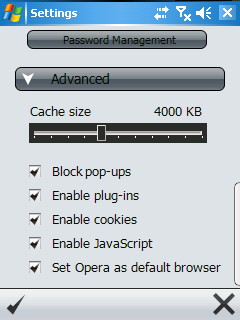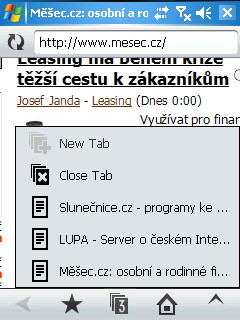 Opera Mobile dokáže zobrazit stránku také v landscape režimu (tj. na šířku), oblíbené weby můžete ukládat do záložek (Opera dokáže pracovat i s Oblíbenými z Internet Exploreru). Od mnoha konkurenčních aplikací se testovaný program liší tím, že podporuje prohlížení v panelech (tabbed browsing). Co se týká paměťových nároků aplikace, tak ty jsou malé, na HP iPaqu hx4700 jsme měli otevřeno i 6 oken a zpomalení Opery bylo minimální. Součástí programu je také jednoduchý download manager.