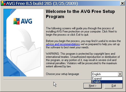 Stažení programu i jeho spuštění je bezproblémové. Program si z vašeho disku ukousne po stažení zhruba 56 MB a spustíte jej na Windows 2000 a novějších. Minimem je 486 procesor a 32 MB RAM, což jsou hardwarové požadavky, které dnes jednoznačně nebude problém splnit. Méně příjemným faktem však je, že bezplatné AVG je dostupné pouze v anglickém jazyce.