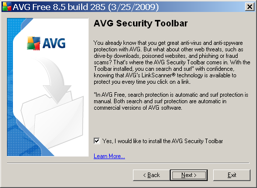 Těsně před koncem instalace budete ještě dotázáni, zda chcete nainstalovat také AVG Security Toolbar – standardně je zapnutý a při jeho použití jste při surfování chráněni proti prakticky všem webovým hrozbám. V AVG Free je tento typ protekce napůl automatický (search protection) a napůl manuální (surf protection). V komerčních verzích je obojí plně automatické.