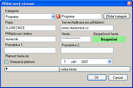 Zajímavým aspektem je volba hesla. Pokud zvolíme heslo slabé, nebo dokonce středně silné, nebudeme připuštěni k pokračování zaheslování a uložení, je tedy třeba volit heslo silné, skládající se z písmen, číslic a znaků. K dispozici je i generátor hesel, pokud nám chybí představivost. Aplikace je vybavena bezpečnostním zámkem, to pro případ, že bychom od počítače odešli, aniž bychom zamkli některý z CRPF souborů. Nechybí ani možnost nastavení časové platnosti hesla, tedy časového úseku, po jehož vypršení přestane fungovat. Hesla lze importovat do XML.