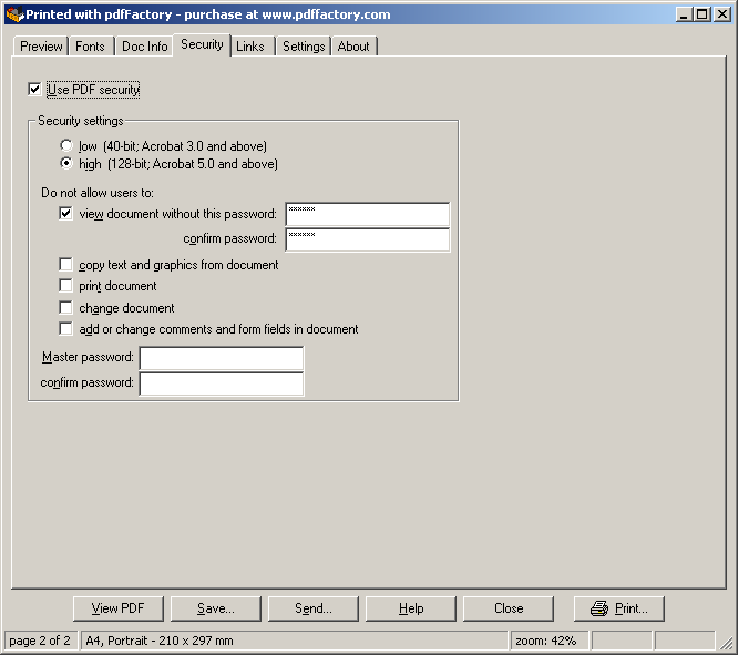 Program umožňuje nastavovat typ použitých písem, vyplňovat údaje, které budou zobrazeny v hlavičce souboru či definovat grafické vyobrazení odkazů. Pro naši bezpečnost je možné soubory zakódovat (lze zvolit mezi 40 a 128 bitovým šifrováním) a tím určit, že k nim nikdo nebude mít přístup bez vložení patřičného hesla.