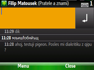 Zprávy je možno odesílat buď tapnutím na ikonu Enteru (pokud máte PDA či komunikátor), jestliže vlastníte smartphone nebo preferujete ovládání pomocí tlačítek, lze zprávy odesílat i stiskem potvrzovacího tlačítka. V nastavení si můžete dokonce navolit, zda k odeslání bude potřeba jeden či dva stisky klávesy. Pigeon ukládá historii textové konverzace, můžete ji však kdykoli smazat.