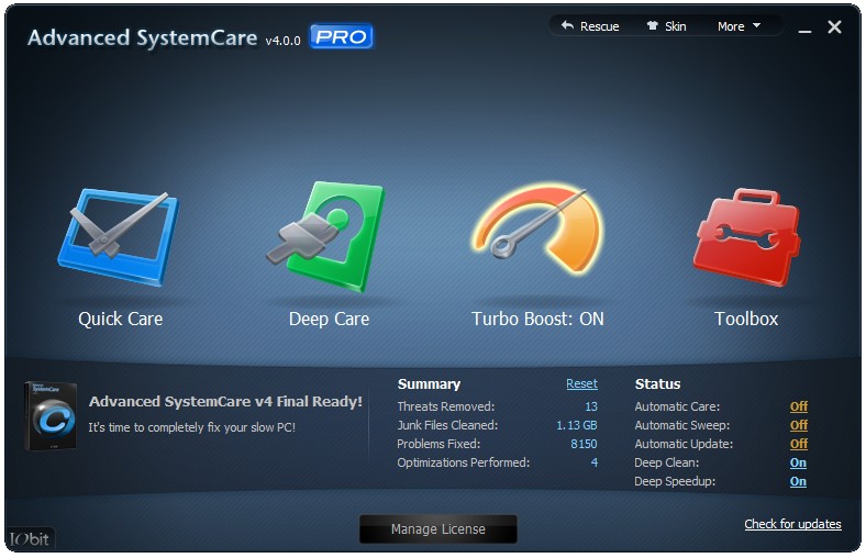 Program Advanced SystemCare je určený k údržbě a ochraně vašeho počítače. V jednoduchém uživatelském prostředí nabízí údržbu a opravu chyb v systémovém registru za pomoci hloubkové analýzy jeho součástí, odstranění případných komplikací a také zrychlení chodu vašeho počítače. Program navíc poskytuje i komplexní ochranu před spywarem, adwarem a dalšími potenciálními hrozbami. Užitečná je též možnost defragmentace pevného disku, úplné odstranění dočasných a již nepotřebných souborů nebo správa aplikací spouštěných po startu operačního systému.