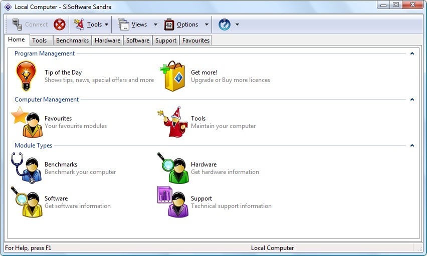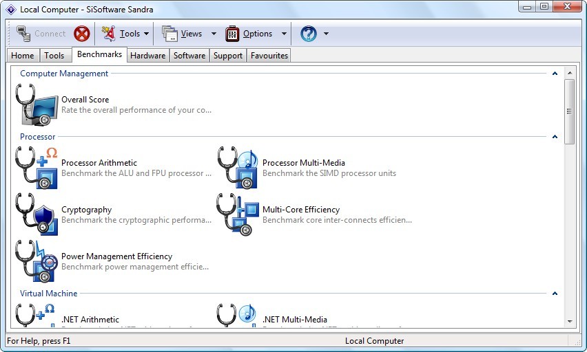 Program Sandra od společnosti SiSoftware je pokročilým nástrojem určeným k provádění benchmarků. Umožňuje zjištění mnoha užitečných informací o hardwaru – procesoru, pevných discích, základní desce, grafickém čipu, nebo výměnných jednotkách, obsažených ve vašem počítači, instalovaném softwaru, a o dalších periferních zařízeních. Program dokáže otestovat také kvalitu bezdrátových technologií, jakými jsou například WiFi či bluetooth adaptéry.
