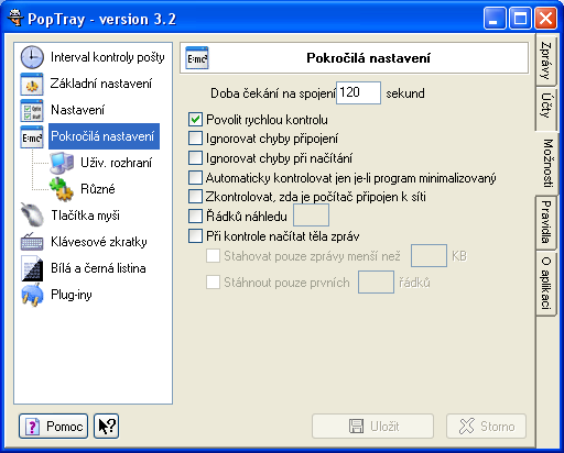 PopTray disponuje na aplikace obdobného charakteru poměrně rozsáhlými možnostmi nastavení. Můžeme zde definovat vše od intervalu kontroly nově příchozí pošty, přes přiřazení jednotlivých emailových klientů k účtům a grafickému odladění celé aplikace, až po pokročilá nastavení, která dovolí vymezit způsob práce s poštou a co nejvíce přizpůsobit uživatelské prostředí individuálním požadavkům.