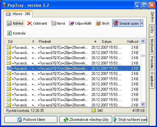 Po nastavení výše zmíněného můžeme přistoupit k samotné práci s elektronickou poštou. Funkcí Check All vyzveme PopTray ke kontrole došlé pošty na naši emailovou adresu. Program následovně stáhne náhledy všech emailů. My pak můžeme některé z nich jen běžně prohlédnout, jiné zpracovat prostřednictvím poštovního klienta a ty nevyhovující ihned vymazat ze serveru.