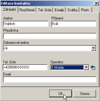 Nacházím-li se v hlavním okně aplikace, pak Nový kontakt vytvoříme stisknutím klávesy Insert. Pro plnohodnotné využití nám bohatě postačí vyplnit první stránku Editace kontaktu. Zadáme Jméno, Příjmení, Telefonní číslo, a Operátora příjemce. Potvrdíme tlačítkem OK. Nyní již máme jeho jméno/přezdívku uvedenou v levé horní tabulce okna programu.