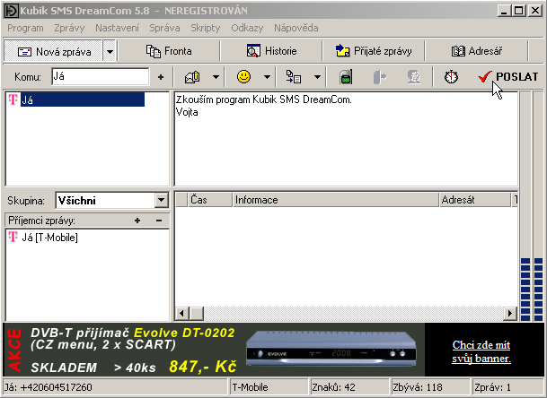 Odeslání SMS zprávy už nyní patří k jednodušším činnostem. Pro určení příjemce poklikáme dvakrát levým tlačítkem myši na jeho jméno. Tím se nám přesune do levé dolní tabulky, kde si můžeme provést jednoduchou optickou kontrolu, že se skutečně jedná o požadovaný kontakt. Samotnou zprávu napíšeme do pravé horní tabulky. V pravém bočním sloupci vidíme využití prostoru pro text. Po napsání textu odešleme SMS zprávu stisknutím tlačítka POSLAT.