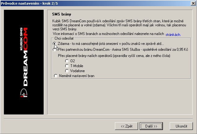 Ihned po instalaci by se měl objevit „Průvodce nastavením“, čítající 5 kroků. Pokud se vám nezobrazil, je možné ho vyvolat v sekci „Nastavení“. Ve následujícím kroku budeme požádání k výběru SMS brány/bran. Já jsem zvolil možnost odesílání „Zdarma“. Krok třetí by měl být implicitně nastaven, takže můžeme vesele pokračovat na další krok, ve kterém budeme vyzvání k importování předchozích kontaktů. Já žádným takovým imporotovatelným seznamem nedisponuji, takže přejdu na poslední, pátý, krok. Zde se dozvím, že používám neregistrovanou verzi a také se zde dočtu výhody registrace. Po přečtení stiskneme tlačítko „Ukončit“.