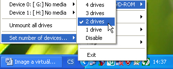 Druhým krokem je nastavení počtu virtuálních mechanik. Pokud máte, stejně jako já, dvě fyzické optické mechaniky a chcete mít k tomu dvě virtuální, prostě jen klepnete pravým tlačítkem myši na ikonku „Daemon Tools“, zvolíte záložku „Virtual CD/DVD-ROM“. Následně kliknete na volbu „Set numer of devices“, neboli nastavit počet zařízení.