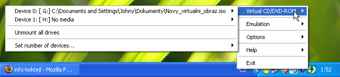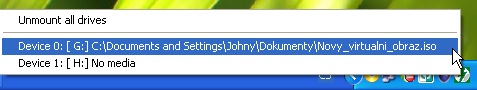 Když si znovu klepnete levým tlačítkem myši na ikonku „Daemon Tools“, ukáže se vám, jaký obsah máte zrovna ve které virtuální mechanice načtený. Tady je vidět, že v „G“ mechanice mám image, který se jmenuje „Novy_virtualni_obraz.iso“. Mechanika „H“ je prázdná…