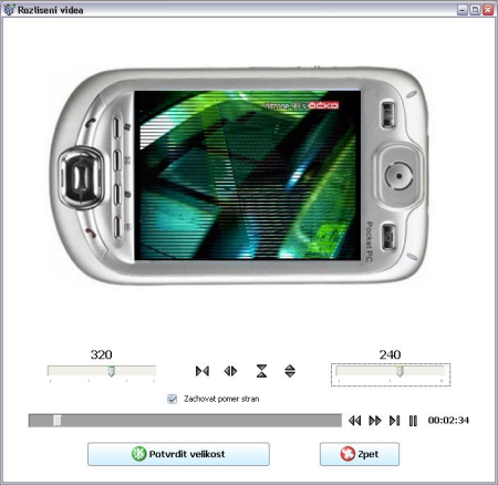 U nastavení zvuku je možné kliknout na rozbalovací šipku, která nám zpřístupní detailní volby. Nejdůležitější položkou je nastavení rozlišení videa. Rozlišení musí přesně odpovídat zobrazovací schopnosti vašeho přenosného zařízení. Pokud neodpovídá, je nutno jej přednastavit pomocí tlačítka změnit. Zobrazí se nám okno pro úpravu rozlišení, kde běží ukázka videa. Viz. obr.