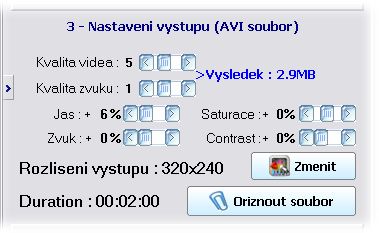 4.Nastavení výstupu (avi soubor) zkontrolujeme si, jaké nám bylo nabídnuto rozlišení, kvalita videa a zvuku. Musíme zvážit, kolik paměťového místa máme k dispozici na přenosném zařízení. Pokud provedeme jakoukoli úpravu, projeví se na výsledné velikosti souboru obr.