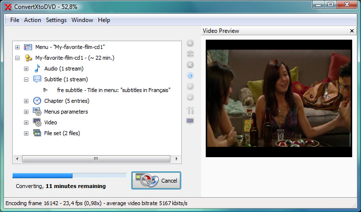 Sháníte kvalitní nástroj pro převod video souborů do formátu, který bez sebemenších obtíží přehraje drtivá většina DVD přehrávačů? Již dále nehledejte! ConvertXtoDVD tento úkol hravě zvládne. Program nabízí vše, co budete k převodu potřebovat. Lze v něm libovolně nastavovat zvukové stopy, titulky, vlastní menu nebo kvalitu převodu.