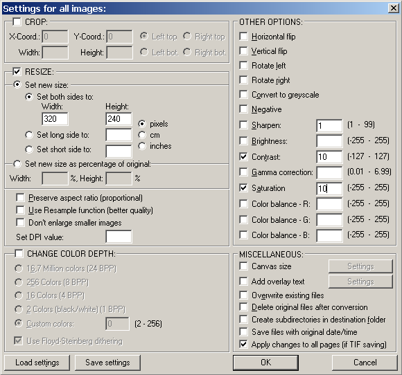 Tím však ještě nekončíme. Zafajfkujte „Advanced options“ a vzápětí klepněte na „Set advanced options“. V této tabulce opět zatrhněte „RESIZE“, kde do „Set both sides to“ vepište 320 pro „Width“ a 240 do „Height“. Napravo zafajfkujte „Saturation“ a „Contrast“ (případně další volby dle uvážení) a do obou políček zadejte „10“. Potvrďte OK a jsme zpět v „Batch conversion“ obrazovce. Zde již stačí jen potvrdit vlevo nahoře „Start“ a převod je zahájen.