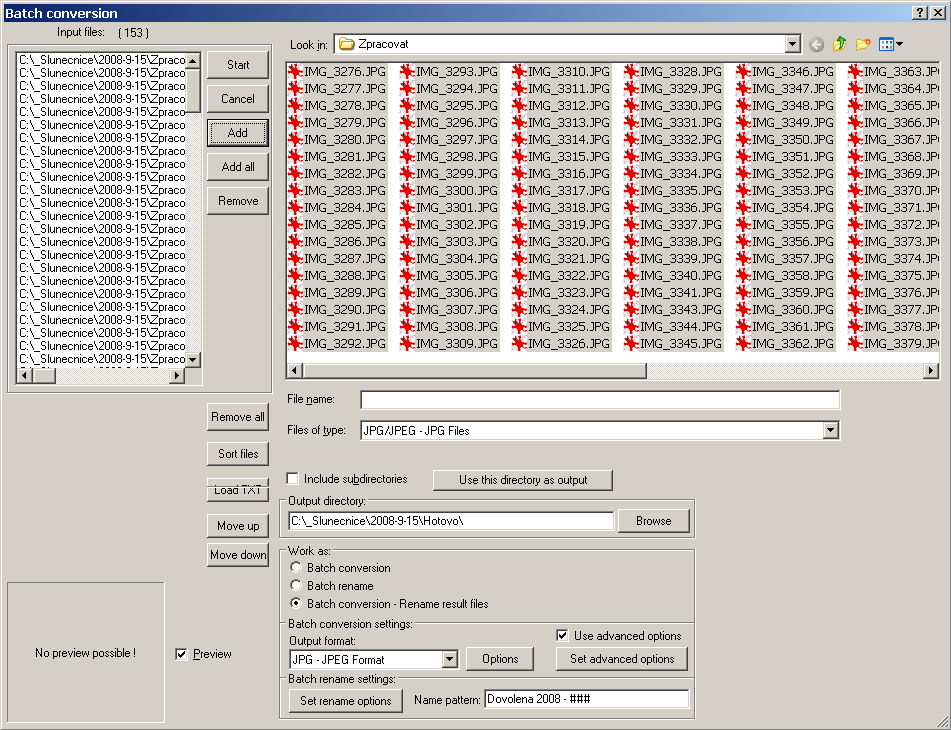 Nejprve přidejte fotografie do procesu – nalistujte si zdrojové fotky v okně vpravo nahoře a označte si pomocí CTRL + A všechny ve výpisu najednou. V menu nalevo vyberte „Add“ a počkejte, dokud se všechny neobjeví ve sloupci vlevo. Pokud chcete, můžete teď některé nežádoucí fotky z řady „vyházet“ či naopak přidat další z jiného adresáře. Jako „Output directory“ si nastavte dříve vytvořený cílový adresář, například „C:\Dovolena 2008 – Holandsko“ a z položek pod tímto adresářem pojmenovaných „Work as“ vyberte „Batch conversion – Rename result files“. Výstupní formát v „Output format“ nastavte na JPEG. Po klepnutí na „Options“ hned vpravo lze upravit věci kolem JPEG konverze, hlavně její kvalitu – čím vyšší číslo, tím lepší kvalita, avšak na druhou stranu také tím větší soubor. U běžných fotek bohatě postačí hodnota mezi 70 a 90kou. V sekci „Batch rename settings“ nastavte přejmenovávací řetězec jak chcete (v našem případě „Dovolena 2008 – ###“) a pokud to uznáte za vhodné, pak i pod „Set rename options“ další doplňující volby (jako třeba od jakého čísla začít počítat, kolik pokaždé připočíst atd).