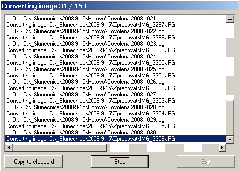 Během probíhajícího procesu jste upozorňováni na to, s jakým obrázkem se právě pracuje. Po akci se vám ještě dostane informace o počtu chyb a upozornění, v ideálním případě bude obojí na nule. Zvolte „Exit“. Tak a je hotovo. Můžete ukončit IrfanView a otevřít cílový adresář. Povšimněte si rovněž, jak příhodně máme soubory přejmenovány od „Dovolena 2008 – 001.jpg“ až po „Dovolena 2008 – 153.jpg“.
