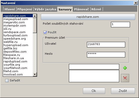 Prvním krokem pro budoucí pohodlné a bezproblémové stahování je nastavení identifikačních údajů pro prémiový přístup k jednotlivým sítím. To lze snadno provést prostřednictvím podkategorie Servery v sekci Nastavení, (standardně vyplníme uživatelské jméno a heslo, tak jak jsme tomu uvyklí při přístupu přes webové rozhraní).