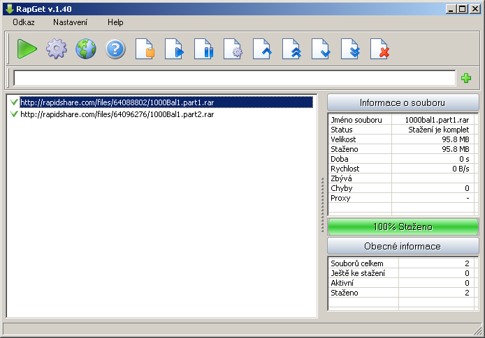 Nyní již můžeme přidávat jednotlivé soubory určené ke stažení. Nejobtížnější ze způsobů je jeho ruční vepsání, jestliže chceme použít méně bolestivou cestu, lze odkazy zkopírovat prostřednictvím schránky, a to dokonce hromadně. RapGet z nich vytvoří frontu, jednotlivé vstupy budou postupně stahovány, což ne nevýznamně šetří čas. Za pomoci ikon situovaných do horní okna lze upravovat pořadí jednotlivých souborů (zajímavou možností je i užití souběžného stahování, viz. obr). Při započetí stahování jsme informováni o dostupných informacích o souboru, vč. aktuální přenosové rychlosti.