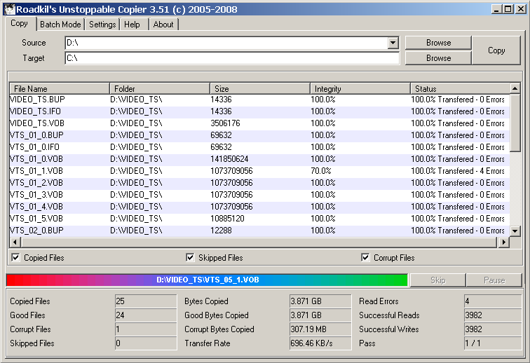 Další informace o procesu přenosu dat nalezneme v dolní části. Jsou zde údaje o počtu zkopírovaných, dobrých, vadných a přeskočených souborech, stejně jako o zkopírovaných bajtech, z toho dobrých datech, zkopírovaných vadných bajtech a o přenosové rychlosti. Vpravo dole ještě nalezneme data o počtu chyb, úspěšně proběhnuvších čteních i zápisech a o počtu průchodů.