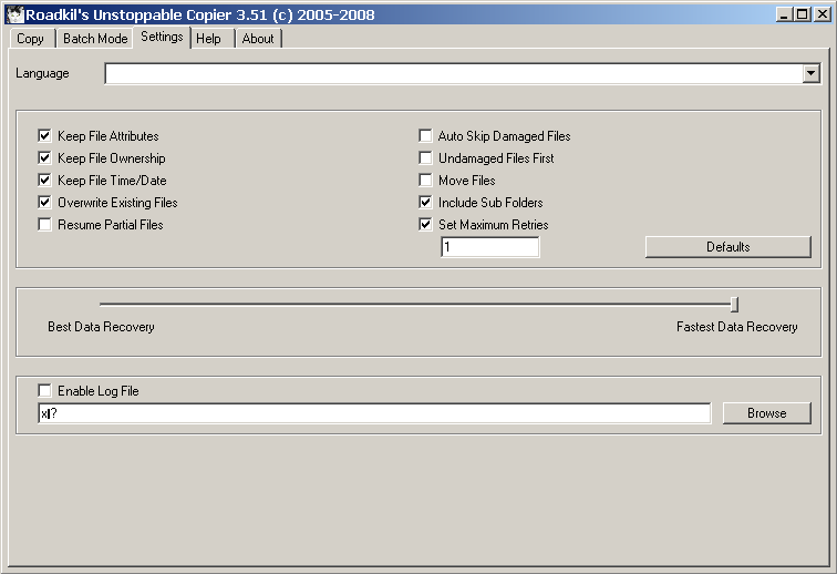 V okně Copy přímo zapíšeme či ručně zvolíme zdrojový adresář (Source). Dále totéž provedeme pro cílový adresář (Target – sem se budou obnovená data kopírovat). Nastavíme volby, jaké uznáme v záložce Settings (o jejích možnostech si povíme více za chvíli) za vhodné a kopírování může začít. Až budeme spokojeni s výběrem, stačí pouze klepnout na volbu Copy. Program Roadkil's Unstoppable Copier plně podporuje hvězdičkovou souborovou konvenci (*.mp3 kopíruje MP3 soubory atd.).