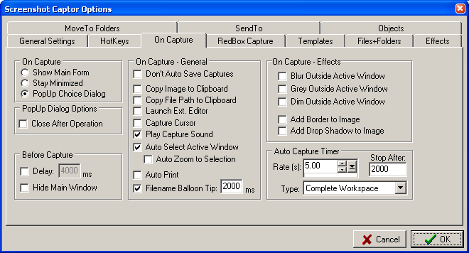 Screenshot Captor dokáže zabrat celou obrazovku, aktuální okno, požadovanou výseč (tu je možné buď označit pro aktuální účel, nebo definovat její velikost, pakliže pořizujeme snímek obdobného rozměru vícekrát po sobě), samozřejmostí je schopnost vyfotit celé okno (pracovní plochu), jež se z důvodu malého rozlišení nevejde na obrazovku. Pakliže pro pořízení snímku potřebujeme nějaký čas (např. otevřít několik záložek atp.), je možné nastavit patřičné zpoždění. V případě specifických požadavků na provedení printscreenu lze definovat další parametry.