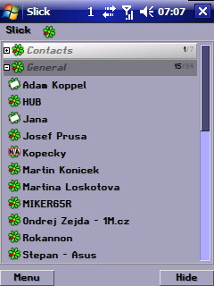 Po zadání všech potřebných údajů se již můžeme připojit. Contact list je v případě ICQ přehledný, lze nechat skrýt nepřipojené uživatele i zachovat rozdělení jednotlivých uživatelů do skupin. Dobrou zprávou je, že znaky s diakritikou v názvech skupin či kontaktů jsou zobrazeny korektně. Nebudeme však Slick pouze chválit, oproti mnoha konkurenčním programům podporuje jen několik základních statusů (online, offline, away, do not disturb, invisible), na rozšířené statusy je třeba si nechat zajít chuť. Malou náplastí na tento neduh budiž fakt, že je možno ke každému statusu přiřadit krátký textový komentář.