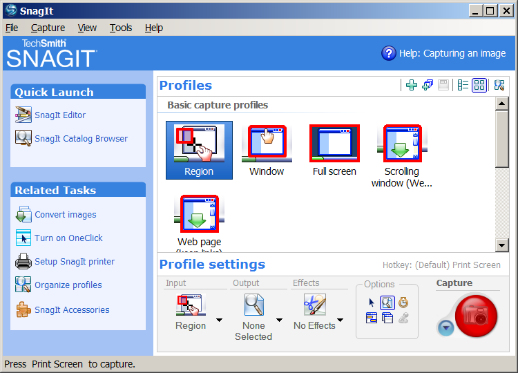 Po spuštění programu vidíme v centru otevřeného okna základní druhy snímání (kategorie Basic Capture Profiles). Od obligátního sejmutí celé obrazovky nebo okna přejdeme k pokročilejším formám tvorby print screenu. SnagIt je v tomto ohledu vybaven celou řadou možností, můžeme „vyfotografovat“ vybraný úsek obrazovky, kontextové menu (možno nastavovat různou dobu prodlevy před stisknutím spouště pro jeho rozsáhlejší rozvrstvení), zajímavou možností je sejmutí celé stránky i v případě, že se nevejde na obrazovku. V tomto případě program automaticky odskroluje a výsledkem dostaneme její neporušený obraz. Stejným způsobem lze ofotit webovou stránku se zachováním všech odkazů.