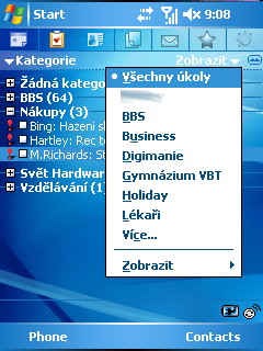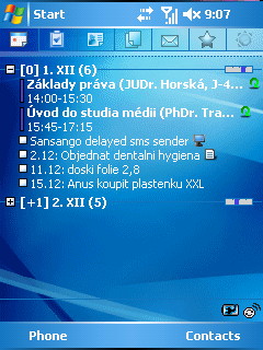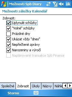 Vzhledem k tomu, že se na plochu Today obrazovky vejde maximálně několik desítek položek (a to jen v případě malého písma), je dobré, že můžete zobrazení na libovolné záložce filtrovat. Např. u kalendáře lze nastavit, s jakým předstihem bude program vypisovat schůzky. Ty můžete filtrovat také podle kategorie či statusu, takže pokud Spb Diary patřičně nastavíte, nebude např. zobrazovat schůzky označené jako „volné“. Obsah jednotlivých dnů lze tapnutím na znaménko „-“ skrýt, číslo v závorce značí, kolika událostmi (tj. schůzkami a úkoly) je třeba se daný den zabývat. Pokud jste si v nastavení vybrali, aby se v případě delšího názvu zobrazil neúplný popisek schůzky, tak na něj stačí 1× tapnout a objeví se kompletní text. V nastavení Spb Diary si můžete definovat, zda se má po „double clicku“ schůzka otevřít v kalendáři či si přejete přejít k její editaci.