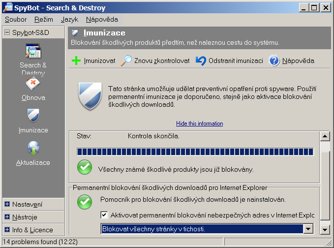 Spybot Search & Destroy je vynikající program pro vyhledání a následnou eliminaci obtěžujícího či nebezpečného obsahu. Na základě dlouholetých zkušeností řady uživatelů, poskytuje jeho užívání v kombinaci Ad-aware komplexní ochranu uživatelského PC. Každý z programů používá k vyhledávání trochu jiné algoritmy, často se tedy stane, že škodlivý obsah, jenž jeden z nich nechal bez povšimnutí druhý nalezl a naopak. Celkový výborný dojem nekazí ani cena, aplikace je distribuována zdarma.