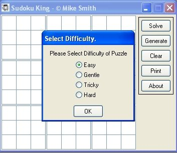 Program Sudoku King nabízí hned čtyři obtížnosti (lehká, mírná, složitá a těžká). Po zvolení obtížnosti viz obr. se náhodně vygeneruje rébus a pak už jen záleží na zručnosti luštitele sudoku.