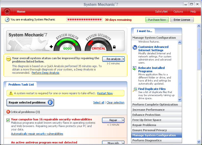 Ihned po spuštění nabídne aplikace možnost provedení analýzy, jejímž cílem je diagnostikovat všechny potencionálně ohrožující prvky našeho systému. V našem případě byl program testován na postarším počítači bez patřičného softwarového vybavení, abychom mohli plně zjistit možnosti programu. Po dokončení analýzy byly zobrazeny tři kritické problémy a pět varování. Jako kritické byla označena nepřítomnost antivirového programu, firewallu a automatických aktualizací. Zatímco v případě dvou prvních aplikace pouze radí, že je dobré zmiňované prvky pořídit, v případě třetím lze zjednat nápravu přímo z menu. Varování byla následující. Bylo zjištěno, že při startu Windows je spouštěn jeden nepotřebný program, který může potencionálně ohrožovat stabilitu či rychlost nabíhání systému. Kliknutím na odkaz pod varováním lze ihned vyvolat utilitu pro správu programů spouštějících se se startem Windows. Daný problém byl během několika sekund odstraněn. Analogicky probíhal proces v případě neužitečného procesu jenž blokoval operační paměť, dosud nezálohovaných ani neoptimalizovných systémových registrů či internetové konfigurace, která nebyla nastavena pro co nejvyšší možnou přenosovou rychlost.