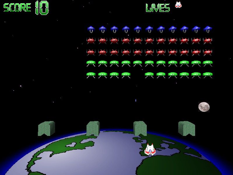 Je tomu již pěkných pár desetiletí, co se objevila první verze hry, jež se později proslavila prakticky na všech platformách. Nesla prosté jméno Space Invaders a jak si v jazyce Shakespearově zběhlí čtenáři jistě již sami přeložili, znamenalo to něco jako „Vesmírní nájezdníci“. A opravdu. Motiv byl vrcholem přímočarosti – na Zemi zaútočili mimozemšťané a jejich družice (resp. oni sami osobně) se nezadržitelně blíží na přistání. Jediný, kdo jim v tom může zabránit, je chrabrý pilot vesmírného modulu, který tyto narušitele zemského prostoru může likvidovat dobře mířenými střelami z palubního kanónu. Mimozemšťané postupují směrem dolů a jakmile sestoupí až úplně vespod obrazovky, hráč končí. Jestliže se mu ovšem podaří jednu vlnu zdolat, brzy se přiříti druhá, neméně otravná. Ačkoliv je mimozemštanů proti hráči (a tedy i střel od nich letících) výrazná přesila, hráč má přece jen trochu usnadněn život díky přítomnosti čtveřice jakýchsi ochran, za něž se dá s trochou šikovnosti a časování skvěle ukrýt. 3D grafika původní motiv nijak neruší, pouze jej rozvíjí trochu jiným (a nikoliv špatným) směrem. Hartelnost není zlá a pokořit rekordy dosažené před desítkou let bude jistě pro nejednoho pamětníka výzva k neodmítnutí… Hra obsahuje něco základních animací i zvuků. Ovládání je velmi snadné – šipky v kombinaci s mezerníkem.