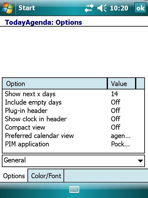 Bezprostředně po instalaci se na obrazovce Dnes objeví přehled úkolů a schůzek. Síla programu však nespočívá v rozhraní, ale v nastavení, které bude hlavním tématem našeho článku. Do „Options“ se dostanete buď z kontextového menu (stačí dlouze podržet stylus nad některým z úkolů či schůzek) nebo ze systémového nastavení (Start – Settings – Today). Pro větší přehlednost rozdělil autor jednotlivé položky do 7 skupin a také díky tomu, že program existuje v české jazykové mutaci by neměl být ani pro aplikace neznalé uživatele problém si TodayAgendu během několika minut nastavit podle svých představ.