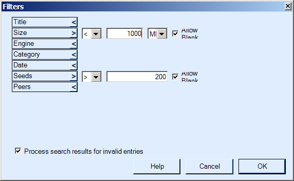 Torrent Harvester se vyznačuje širokými možnostmi vyhledávání. Obsahuje téměř devadesát vyhledávácích enginů, přičemž se neomezuje pouze na sítě typu torrent. Vyhledávání samotné je extrémně snadným procesem, plně postačuje vepsat název požadovaného souboru a iniciovat celý proces poklikem na ikonu Search. Výsledky jsou zobrazovány průběžně, při zadání známějšího hesla jich může být i několik tisíc. Pro omezení počtu výstupů lze obsah filtrovat. Máme možnost upravit maximální velikost, nebo naopak minimální počet uživatelů, kteří jej v dané chvíli poskytují.