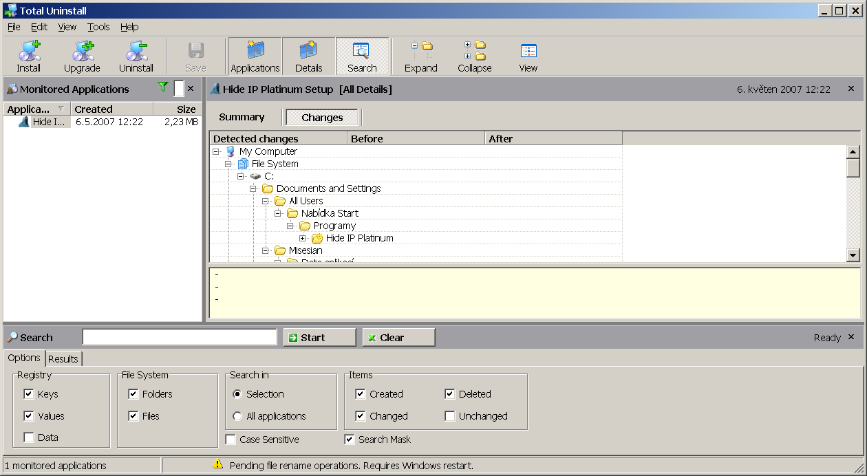 Total Uninstall zmapuje stav systému před každou novou instalací, to stejné udělá po ukončení. Výsledkem je tedy protokol veškerých změn, které instalovaná aplikace v našem počítači provedla. Díky tomuto máme možnost kompletně odinstalovat dokonce i aplikaci, která by neobsahuje žádný odinstalovací proces.