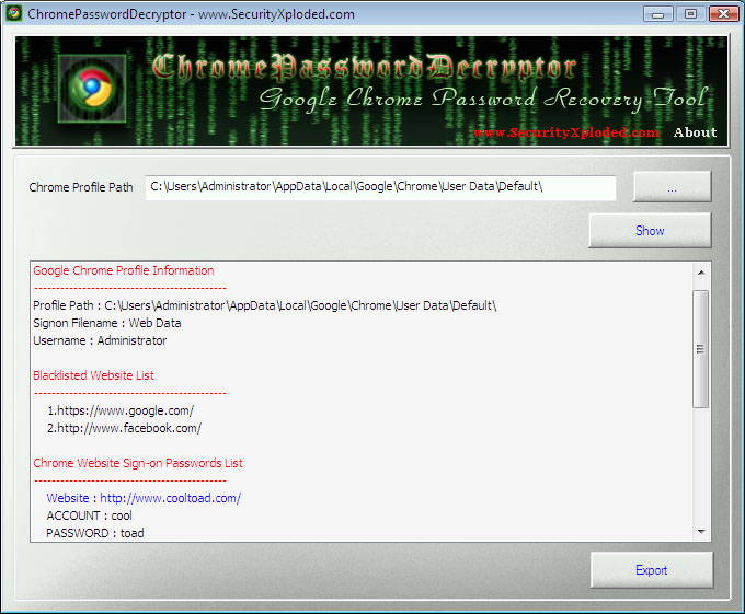 ChromePasswordDecryptor je jednoduchá pomůcka pro informace o uživatelském profilu internetového prohlížeče Google Chrome. Kromě detailních informací o profilu program vypíše i příslušné uživatelské jméno a heslo. Protokol je možno exportovat do HTML formátu. Program se neinstaluje.