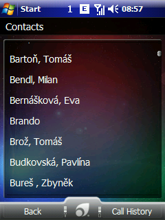 PointUI2 nabízí také jednoduchý pohled na kontakty. Ty jsou setříděny abecedně (podle příjmení). Zobrazení nelze bohužel změnit, takže nelze např. kontakty seřadit podle firem. Když už je řeč o kontaktech, je vhodné zmínit, že testovaný program umožňuje vytvoření seznamu oblíbených kontaktů, ze kterého lze vytočit až 9 lidí pouhým ťuknutím na jejich fotografii.