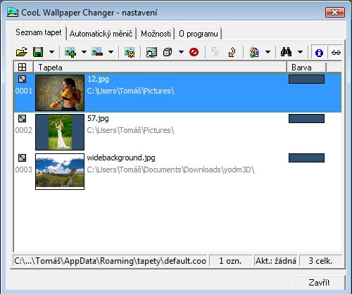 A na závěr dnešního dílu si představíme program Cool Wallpaper Changer, správce tapet s mnoha funkcemi. Rádi měníte tapety na své ploše? A co takhle nechat Cool Wallpaper, aby to dělal automaticky za vás. Jednoduše si zvolte tapety a potom už zbývá jenom nastavit kritéria jejich obměny. Tapety se vám mohou měnit každý den, měsíc, nebo minutu. Je jen na vás jak často chcete mít na pozadí jiný obrázek. Každému z obrázků lze nastavit typ umístění (dlaždice, roztáhnout, na střed) a barvu. Tapety nahrajete do přehledného seznamu, podle kterého se budou zobrazovat, nebo nastavíte zobrazování náhodné. Jeden seznam může mít až 2000 tapet. S Cool Wallpaper Changer tak budete mít jinou tapetu každý měsíc a nebo třeba každých deset minut.