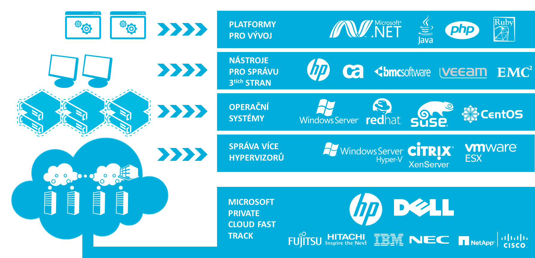 Pro datacentra i webhosteryPrivátní cloud od Microsoftu staví na důvěrně známých technologiích. Jeho vybudování tak není pro IT administrátory znalé Windows Server 2008 R2 nijak těžké. Síla privátního cloudu od Microsoftu je v tom, že se primárně zaměřuje na poskytování maximálního výkonu provozovaných aplikací a automatizaci všech procesů správy, údržby a monitoringu v rámci heterogenního prostředí s maximálním ohledem na ochranu Vašich investic. Je proto ideální jak pro firmy, které chtějí centralizovat svoji serverovou infrastrukturu, tak třeba pro poskytovatele webhostingu a serverhostingu. Vhodný je i pro firmy, které nemají dostatek personálních kapacit pro údržbu serverové infrastruktury. Anebo tehdy, když firmy potřebují efektivně vykrývat skokové výkyvy systémových nároků u jednotlivých serverových aplikací.