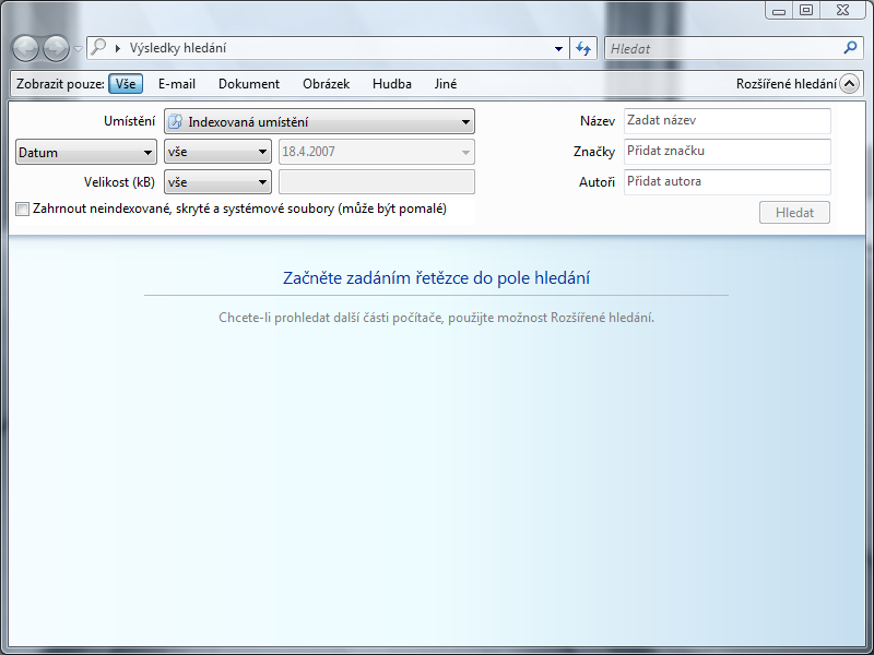 Širší možnosti nabízí Rozšířené vyhledávání, které je v operačním systému také přítomno. Po kliknutí na odkaz Hledat v menu Hlavního panelu se otevře okno určené pro zobrazení výsledků vyhledávání. Vyhledávání tak ve Windows konečně dostalo důstojnou podobu.