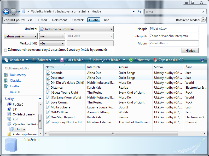 Výsledky vyhledávání lze uložit pro případné pozdější použití. Nabídka funkcí dostupných v Rozšířeném vyhledávání se také upravuje podle typu vyhledávaných souborů. V případě vyhledání například zvukových souborů se přímo zobrazí odkazy na jejich přehrání nebo vypálení ve formě hudebního CD.