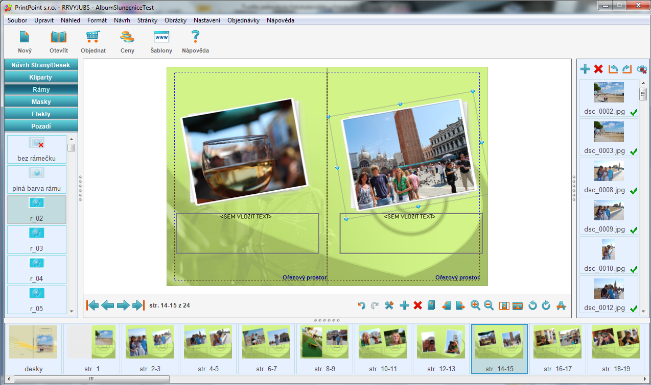 Obrázky vkládané do vaší fotoknihy, kalendáře, či pexesa, je možné upravovat přímo v programu v několika stupních. První položku v menu je návrh stránky, kde si vybíráte, kolik fotek a jak má být na stránce rozmístěno. Jedná se pouze o doporučené návrhy a fotky si můžete na stránku umístit naprosto libovolně. Druhou položkou jsou kliparty, těch ale není v AlbumMakeru mnoho.