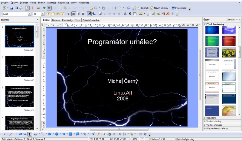 Práce se šablonami není ještě v Impress zcela dotažená do konce, takže pokud hodláte používat nějakou šablonu, pak doporučuji hned od začátku průběžně celý dokument ukládat. Zaručíte tím průběžnou kontrolu nad výsledkem a zabráníte nemilým překvapením. Při exportu výsledného díla pak doporučuji tisk do formátu PDF a prezentovat z tohoto univerzálního formátu dokumentů, který vám garantuje, že výsledek vaší prezentace bude autentický s tím, co jste si doma vytvořili.
