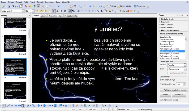 Pokud chcete nějaké objekty na slidech rozpohybovat, pak vše nastavujete právě zde (ovšem neprovádějte export do PDF). Nastavit je možné jak druh pohybu, tak jeho načasování, rychlost či pořadí. To jistě užijí například učitelé chemie na animaci vzniku vazeb.