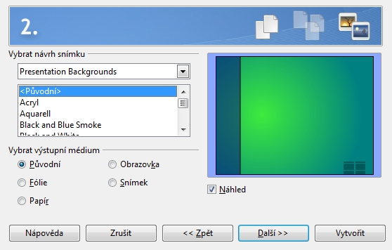 V balíku OpenOffce.org má tvorbu prezentací na starosti nástroj Impress. Po jeho spuštění vás přivítá jednoduchý průvodce. Záleží na vkusu každého jednotlivce, ale já osobně průvodce příliš v oblibě nemám. Pro začátečníka však může být poměrně příjemný. Lze ho kdykoli ukončit buď stisknutím tlačítka zrušit (čímž ovšem zabráníte spuštění Impressu) nebo kliknutím na vytvořit. Touto druhou možností spustíte tvorbu prezentace právě v takovém stavu nastavení, v jakém jste na tlačítko klikli. Není tedy potřeba nastavovat vše.