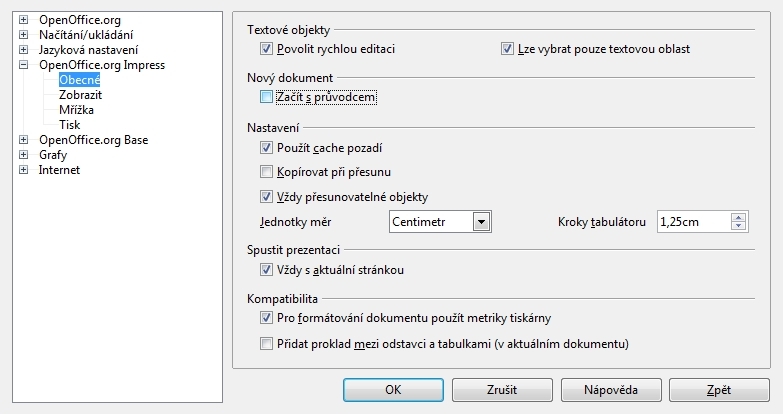 Pokud nemáte o průvodce při spuštění zájem, je možné ho snadno vypnout. V menu „Nástroje → Volby“ v seznamu vyberete „OpenOffice.org Impress“, položku „Obecné“ a v nabídce nastavení pak odznačíte políčko „Začít s průvodcem“.