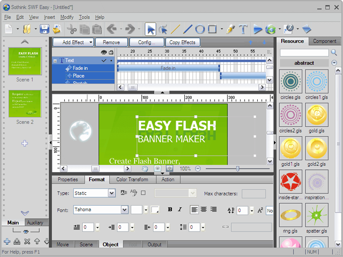 Program Sothink SWF Easy se zaměřuje na přípravu animovaných menu, interaktivních tlačítek, bannerů a ostatních flashových animací, které lze použít při přípravě webových stránek. Příprava jednotlivých flashových prvků probíhá v integrovaném editoru, jehož ovládání je intuitivní. Program nabízí více než osmdesát předpřipravených šablon a šedesát přechodových efektů, jež můžete při tvorbě animací použít. Šablony a přechodové efekty lze navíc v případě potřeby modifikovat. Vytvořenou animaci je možné ještě před jejím uložením shlédnout. Pokud budete s výsledkem spokojeni, pak můžete své dílo uložit do formátů SWF, AVI, GIF, nebo HTML5.